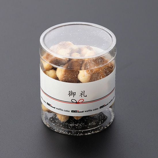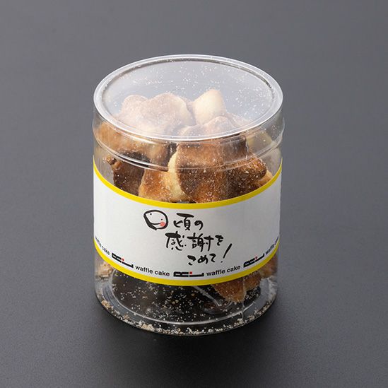 「お世話になりました」「日頃の感謝をこめて!」「御礼」「Thank You」4種のメッセージラベルが選べるワッフル型のクッキー入りミニボトルです。