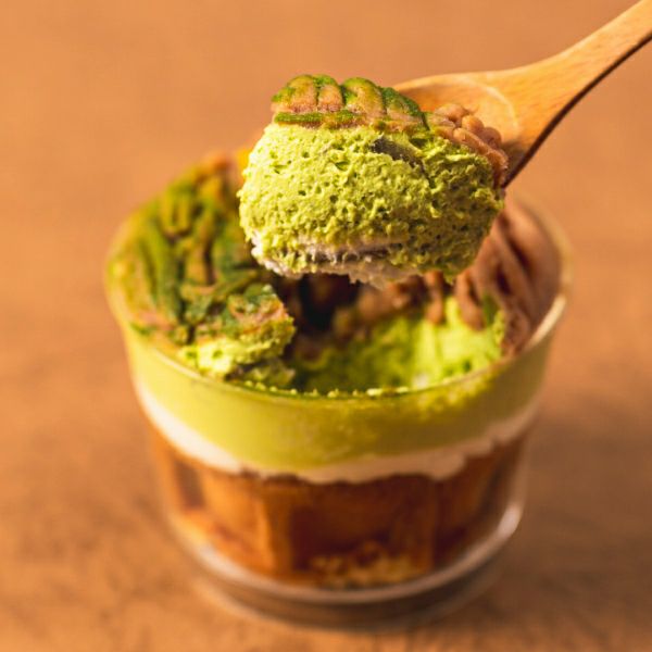 キャラメルソースを忍ばせたホイップクリームと、渋皮付きの栗甘露煮入りの抹茶クリームをふわふわのワッフルに重ね、ラム酒がほんのり香る風味豊かなマロンクリームを絞りました。