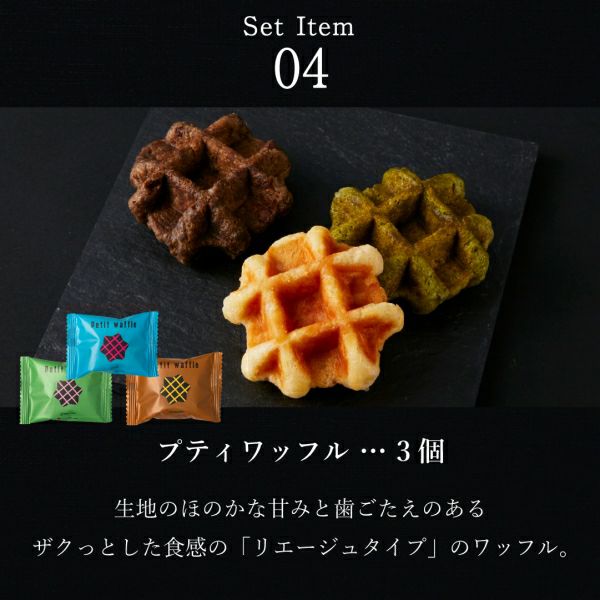 3種類の焼き菓子は、サクッと軽いクリスピーワッフル、しっとりタイプのリエージュワッフル、サクサク食感のワッフル型クッキーをバラエティ豊かに。