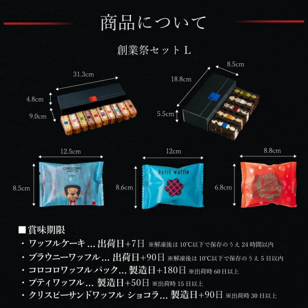 ○ ワッフルケーキ... 出荷日+7日*解凍時間の目安は冷蔵庫で約7時間です。解凍後は10℃以下で保存のうえ、24時間以内にお召し上がりください。 ○ ブラウニーワッフル... 出荷日+90日*解凍時間の目安は冷蔵庫で約3時間です。解凍後は10℃以下で保存のうえ、5日以内にお召し上がりください。 ○ クリスピーサンドワッフルショコラ... 製造日+90日※出荷時30日以上 ○ コロコロワッフル... 製造日+180日、※出荷時60日以上 ○ プティワッフル... 製造日+50日※出荷時15日以上 |