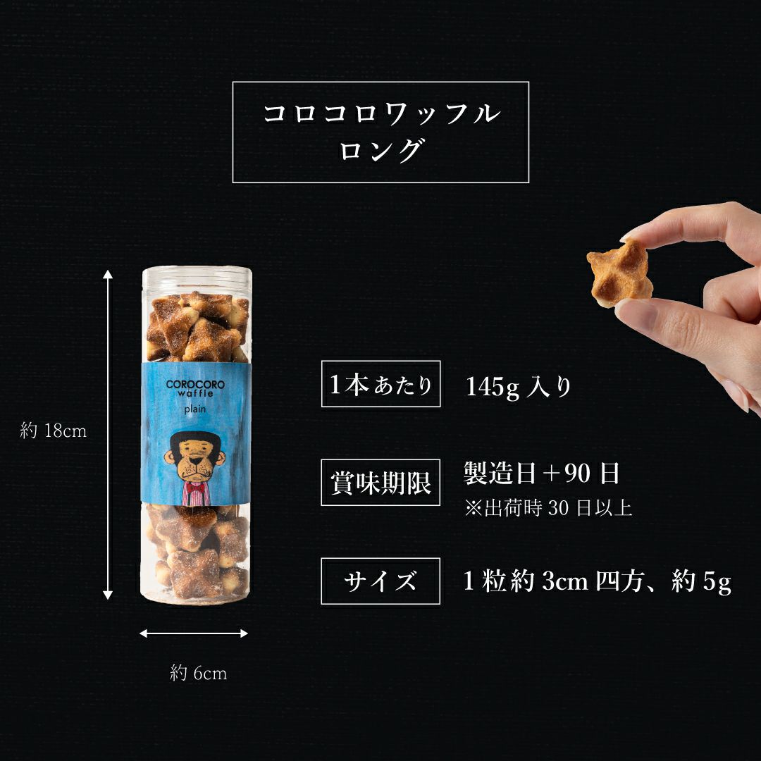 ○コロコロワッフルロングケース「プレーン」「メープル」各1本ずつ※1本145g入り(筒サイズ:高さ約180mm×直径約60mm) |