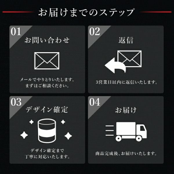 最短でご注文確定後11日以降※(一部地域を除く) 【遠方地域についてはこちら】 ※個数に応じて納期が変わります。詳細は画像をご確認ください。 ※50個以上からご注文を受け付けております。 ※規定以外の個数や納期をご指定の場合、キャンセルとなる可能性がございます。