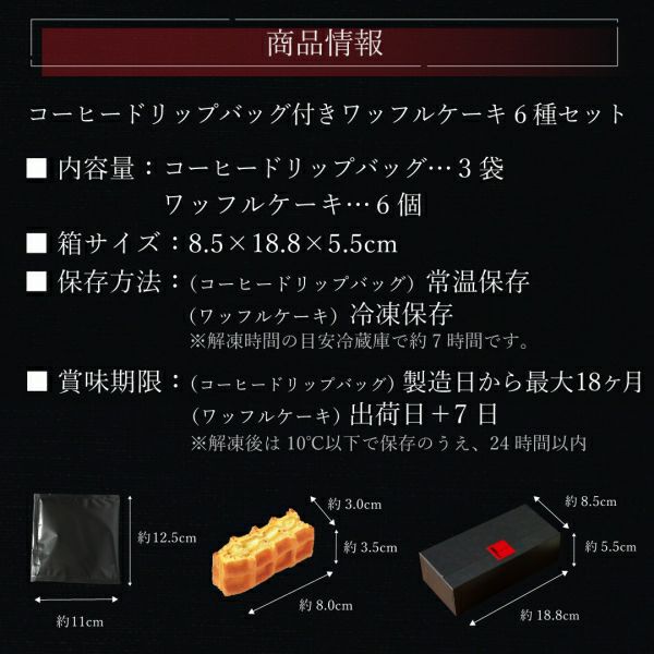 〇ワッフルケーキ6個(プレーン、チョコ、バニラカスタード、あずき、抹茶、ストロベリー) 〇コーヒードリップバッグ3袋 |