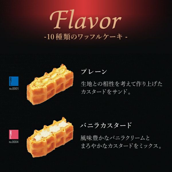(計10種:プレーン、バニラカスタード、抹茶、ストロベリー、チョコ、メープル、ショコラ、ティラミス、あずき、フルーツカスタード) |