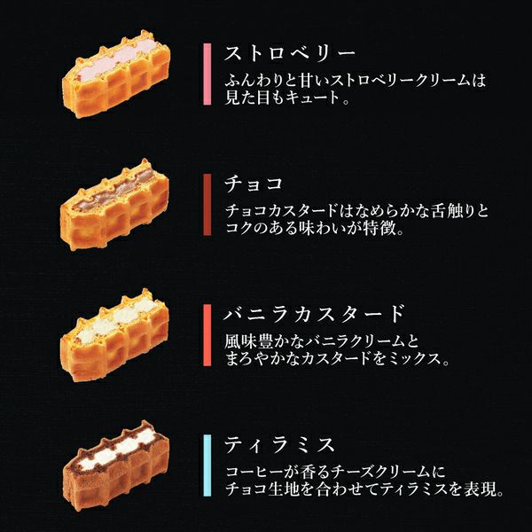 12個 (計12種:プレーン、バニラカスタード、抹茶、ストロベリー、チョコ、メープル、ショコラ、ティラミス、あずき、栗きんとん、もも、つぶつぶストロベリー) |