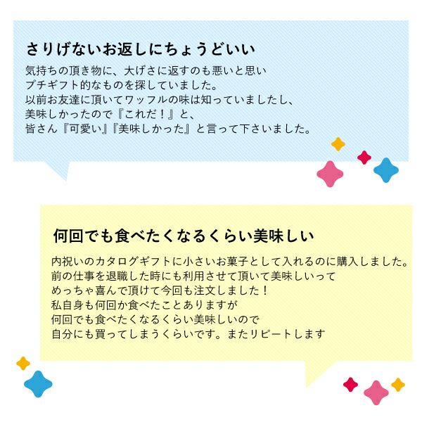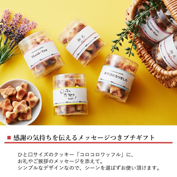 「お世話になりました」「日頃の感謝をこめて!」「御礼」「Thank You」4種のメッセージラベルが選べるワッフル型のクッキー入りミニボトルです。