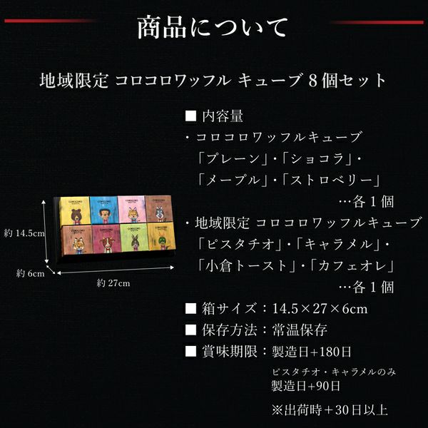 ・コロコロワッフルキューブ「プレーン」・「ショコラ」・「メープル」 ・「ストロベリー」...各1個 ・地域限定コロコロワッフルキューブ「カフェオレ」・「キャラメル」・「ピスタチオ」 ・「小倉トースト」...各1個 |
