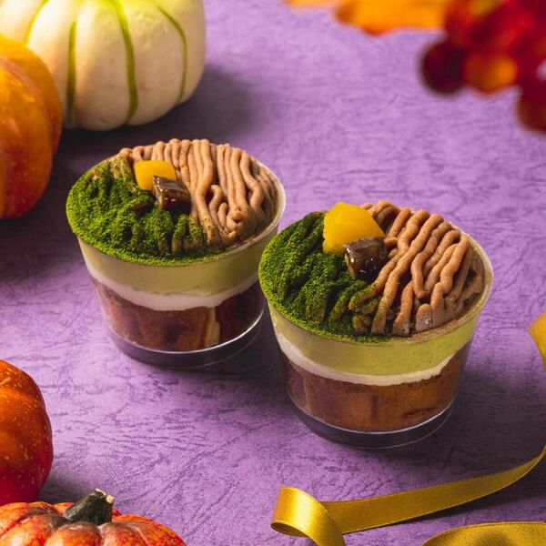 キャラメルソースを忍ばせたホイップクリームと、渋皮付きの栗甘露煮入りの抹茶クリームをふわふわのワッフルに重ね、ラム酒がほんのり香る風味豊かなマロンクリームを絞りました。