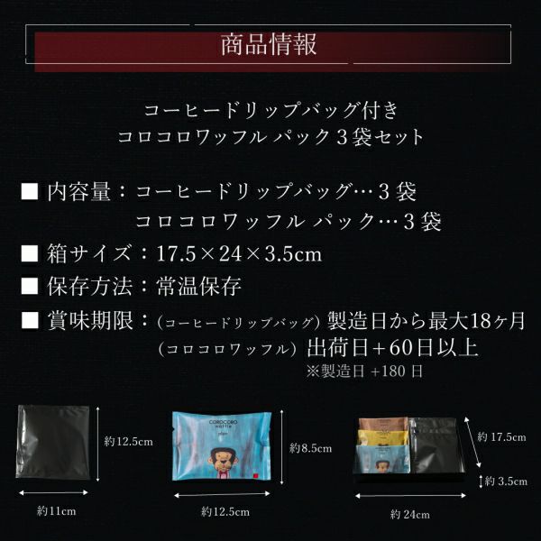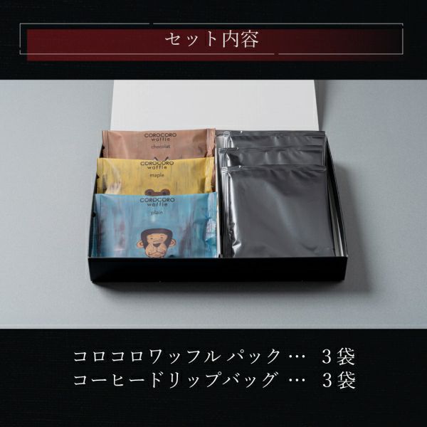 〇コロコロワッフル20g×3袋(プレーン・メープル・ショコラ…1袋) 〇コーヒードリップバッグ3袋 |