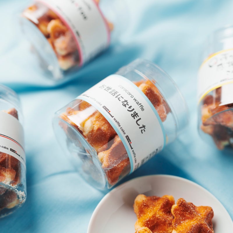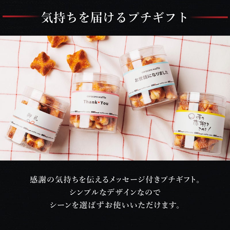 「お世話になりました」・「Thank You」・「日頃の感謝をこめて!」・「御礼」の4種のメッセージラベルが選べるワッフル型の焼き菓子入りミニボトルです。