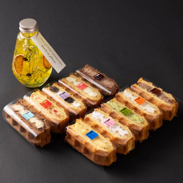 キラキラと美しいハーバリウムと、定番のワッフルケーキ10種をセットに。